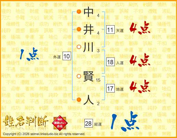 中(4画)井(4画)川(3画) 賢(15画)人(2画)