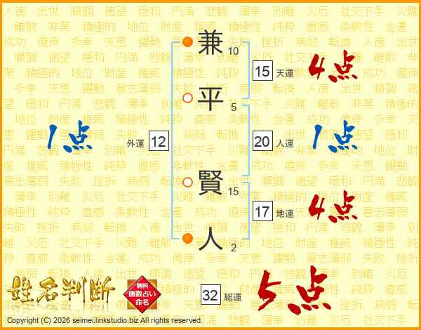 生活面を象徴する運勢です。外部から受ける影響力を表し、結婚運、家庭運や職場、環境への順応性を表します。総運から人運を引いた画数。姓や名が1文字の場合を除く。