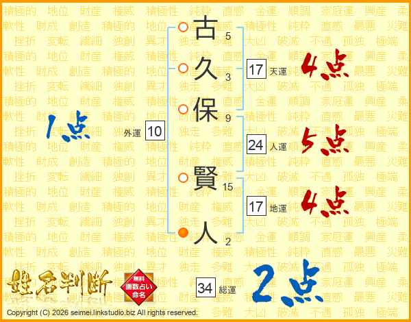 古(5画)久(3画)保(9画) 賢(15画)人(2画)