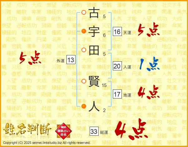 古(5画)宇(6画)田(5画) 賢(15画)人(2画)