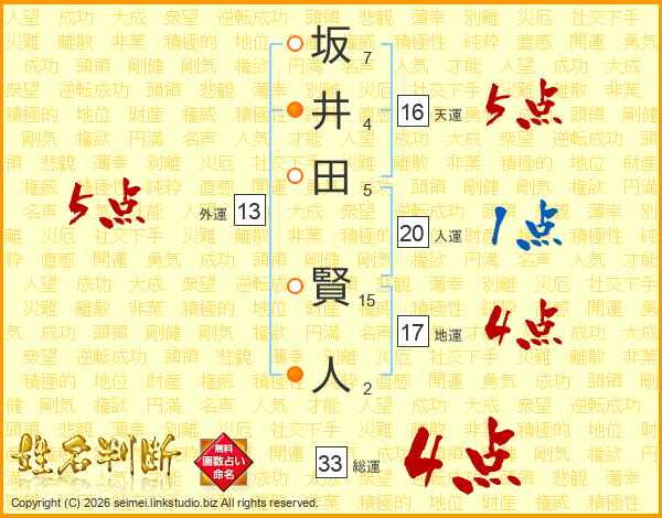 坂(7画)井(4画)田(5画) 賢(15画)人(2画)