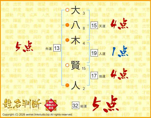 大(3画)八(8画)木(4画) 賢(15画)人(2画)