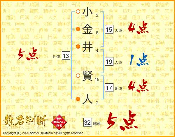 小(3画)金(8画)井(4画) 賢(15画)人(2画)