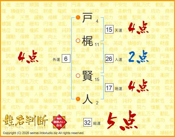 戸(4画)梶(11画) 賢(15画)人(2画)