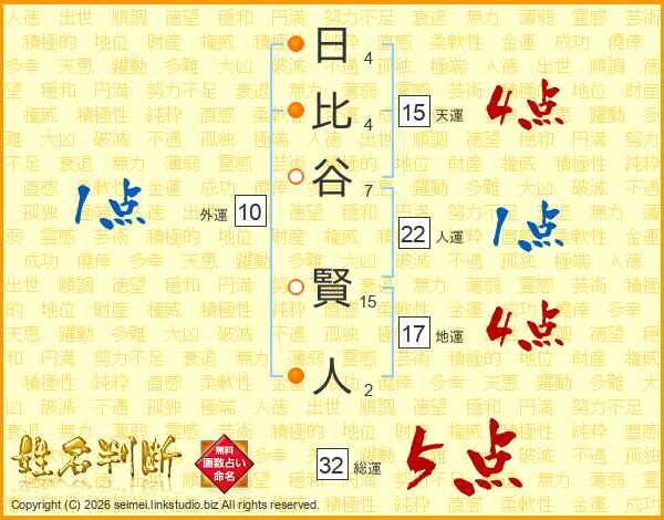 日(4画)比(4画)谷(7画) 賢(15画)人(2画)