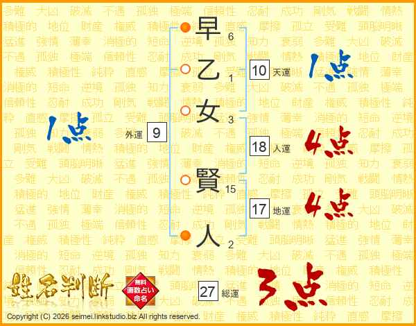 早乙女賢人さんの総運は27画の3点!