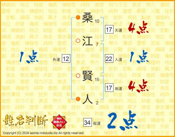 生活面を象徴する運勢です。外部から受ける影響力を表し、結婚運、家庭運や職場、環境への順応性を表します。総運から人運を引いた画数。姓や名が1文字の場合を除く。