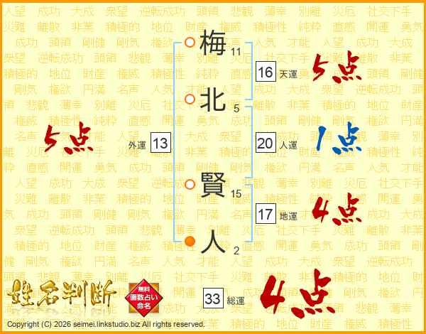 梅(11画)北(5画) 賢(15画)人(2画)