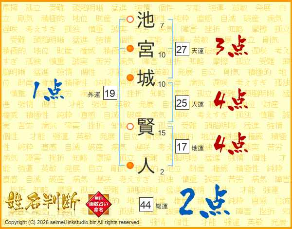 池(7画)宮(10画)城(10画) 賢(15画)人(2画)