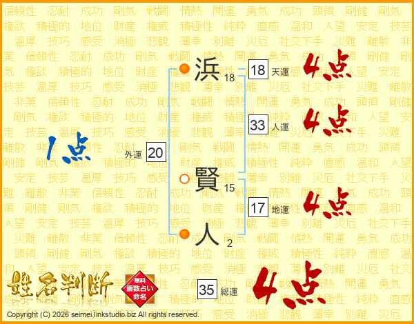 浜(18画) 賢(15画)人(2画)