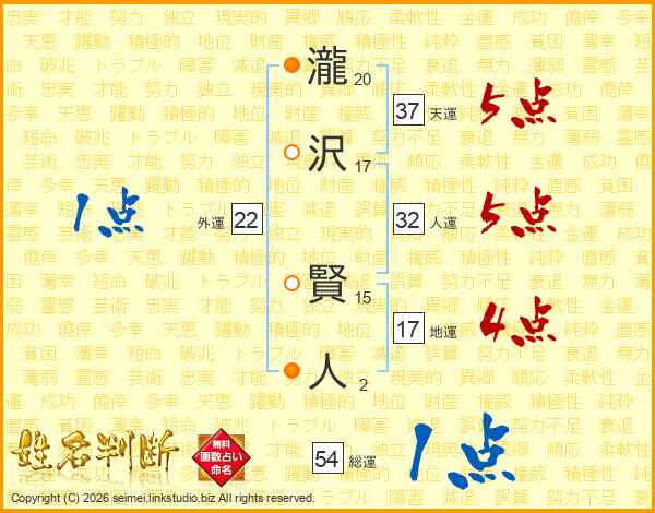 瀧(20画)沢(17画) 賢(15画)人(2画)