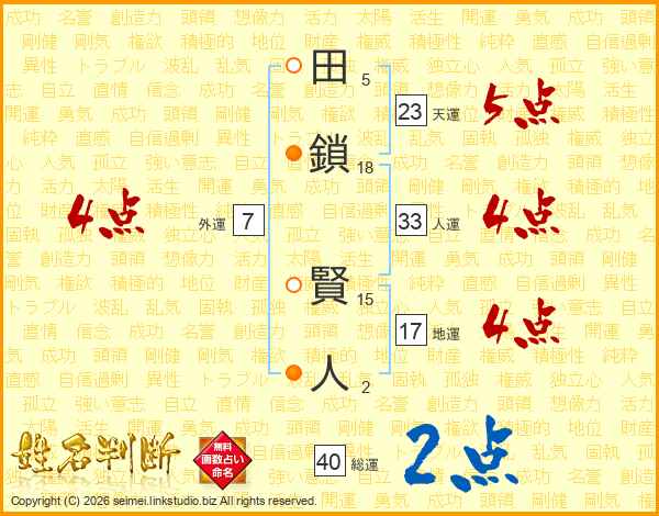 田(5画)鎖(18画) 賢(15画)人(2画)