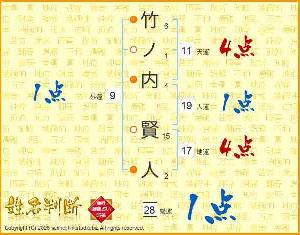 竹ノ内賢人さんの天運は11画の4点!