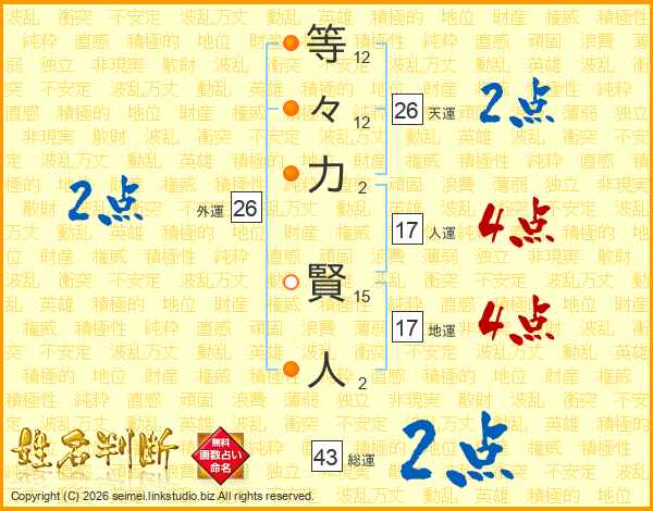 等(12画)々(12画)力(2画) 賢(15画)人(2画)