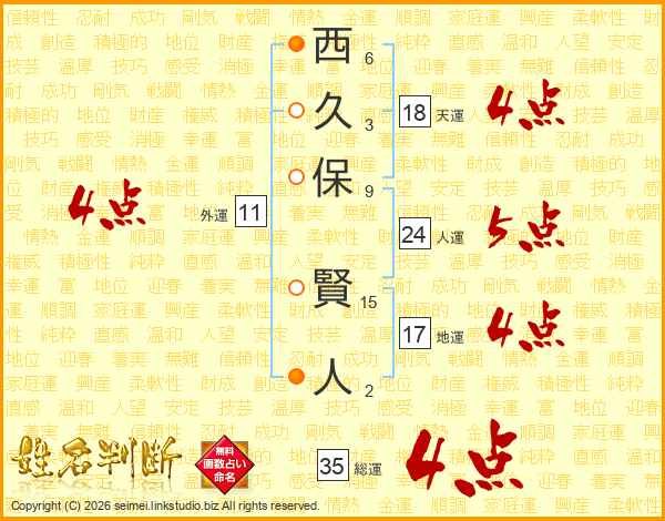 西(6画)久(3画)保(9画) 賢(15画)人(2画)