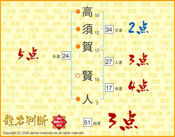 高須賀賢人さんの総運は51画の3点!