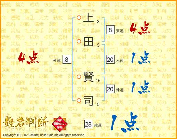 上(3画)田(5画) 賢(15画)司(5画)