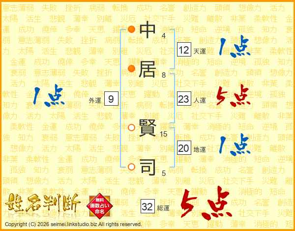 中(4画)居(8画) 賢(15画)司(5画)