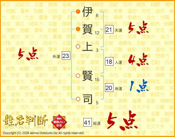 伊(6画)賀(12画)上(3画) 賢(15画)司(5画)