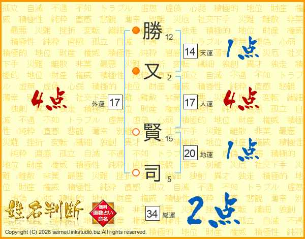 勝(12画)又(2画) 賢(15画)司(5画)