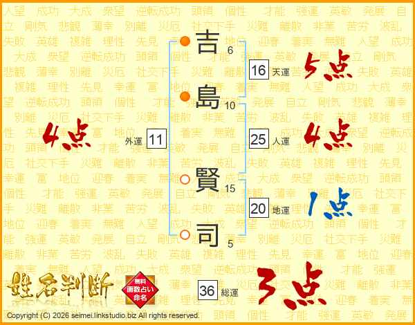 あなたの人生を表す1番重要な運勢です。生涯を通じて影響する総合運となり、主に50歳以降の晩年期に影響を及ぼします。苗字と名前の合計画数。