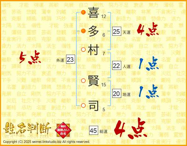 喜(12画)多(6画)村(7画) 賢(15画)司(5画)