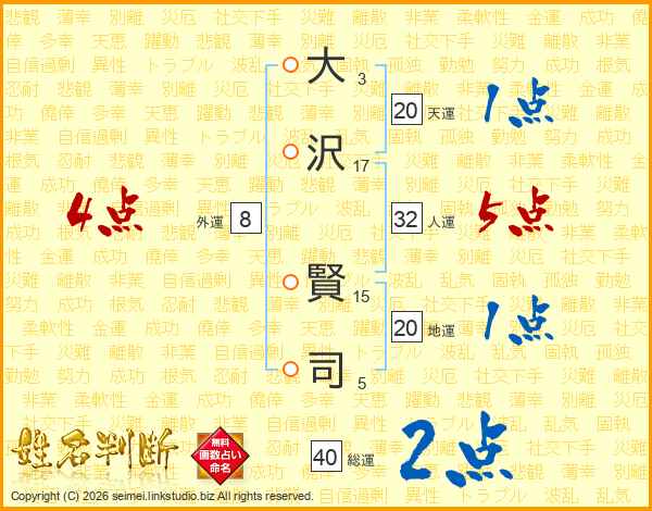 大(3画)沢(17画) 賢(15画)司(5画)