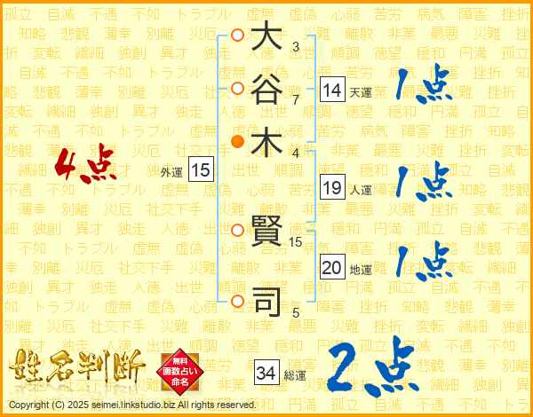 大(3画)谷(7画)木(4画) 賢(15画)司(5画)
