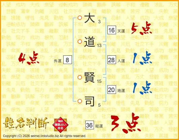大(3画)道(13画) 賢(15画)司(5画)
