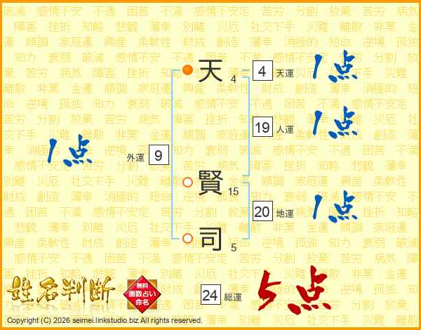 天(4画) 賢(15画)司(5画)