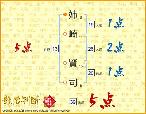 姉(8画)崎(11画) 賢(15画)司(5画)