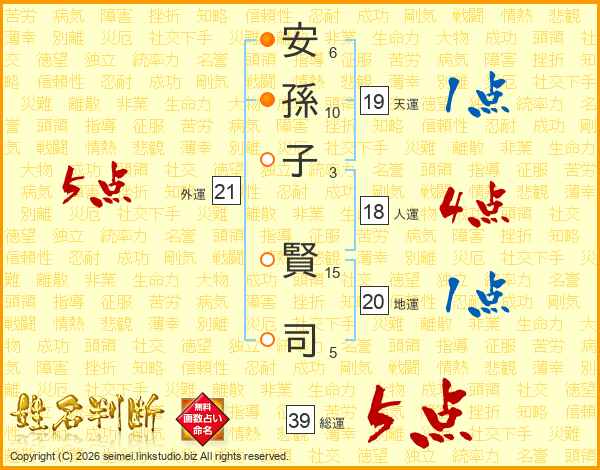 安(6画)孫(10画)子(3画) 賢(15画)司(5画)