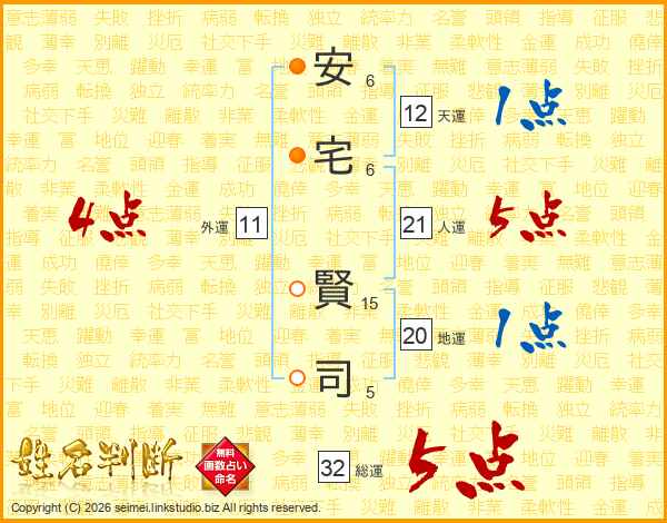 生活面を象徴する運勢です。外部から受ける影響力を表し、結婚運、家庭運や職場、環境への順応性を表します。総運から人運を引いた画数。姓や名が1文字の場合を除く。