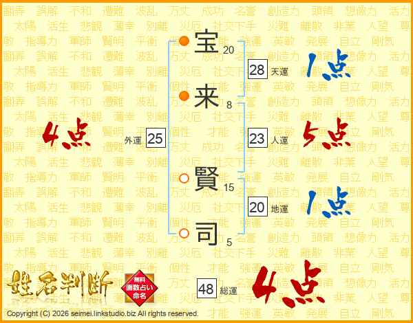 宝(20画)来(8画) 賢(15画)司(5画)