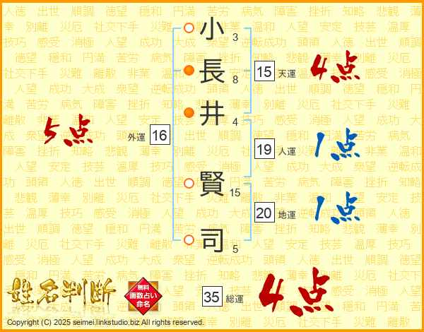小(3画)長(8画)井(4画) 賢(15画)司(5画)