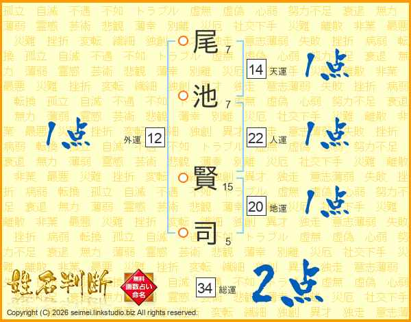 尾(7画)池(7画) 賢(15画)司(5画)