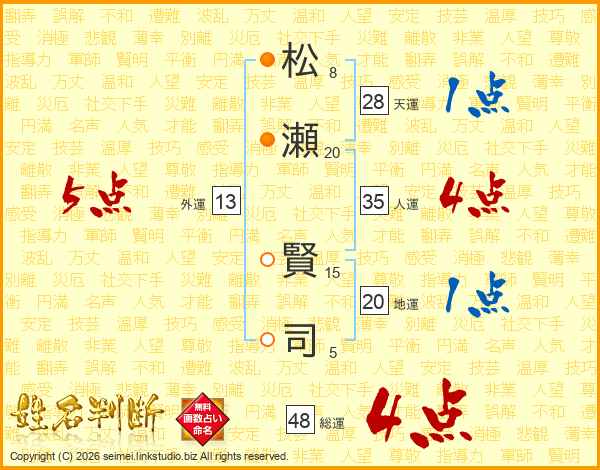 松(8画)瀬(20画) 賢(15画)司(5画)