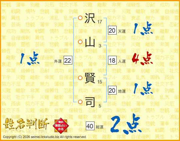 生活面を象徴する運勢です。外部から受ける影響力を表し、結婚運、家庭運や職場、環境への順応性を表します。総運から人運を引いた画数。姓や名が1文字の場合を除く。