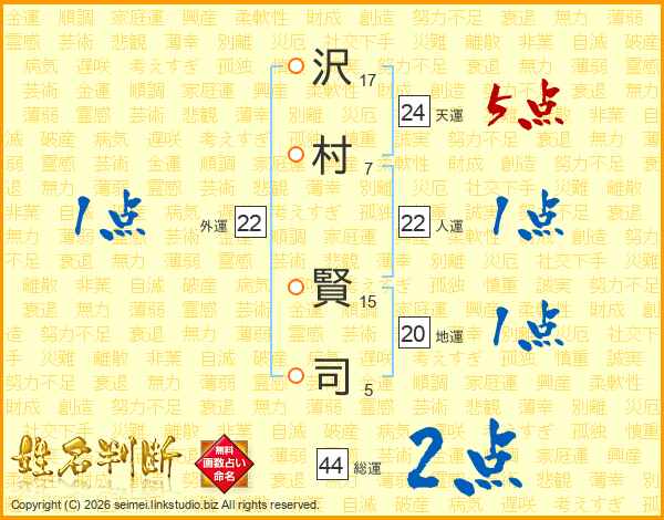 沢(17画)村(7画) 賢(15画)司(5画)