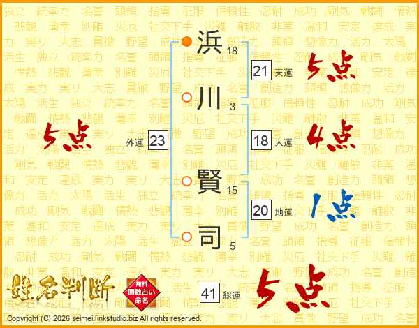 浜(18画)川(3画) 賢(15画)司(5画)