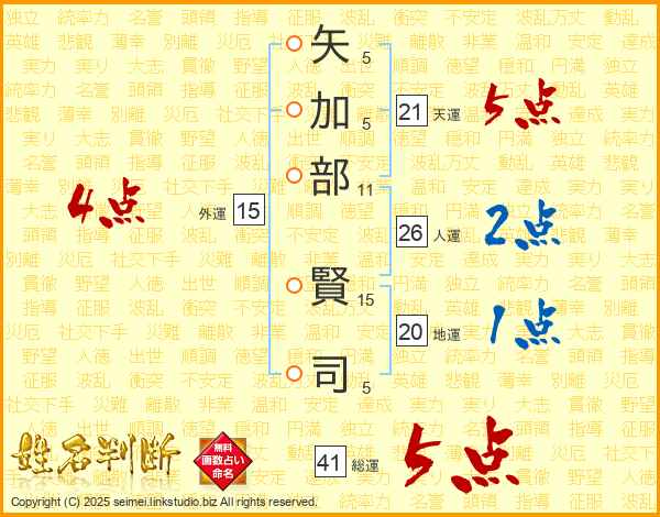 矢(5画)加(5画)部(11画) 賢(15画)司(5画)