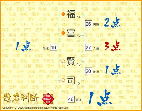 福(14画)富(12画) 賢(15画)司(5画)