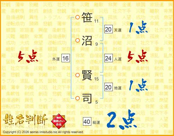 笹沼賢司さんの人運は24画の5点!