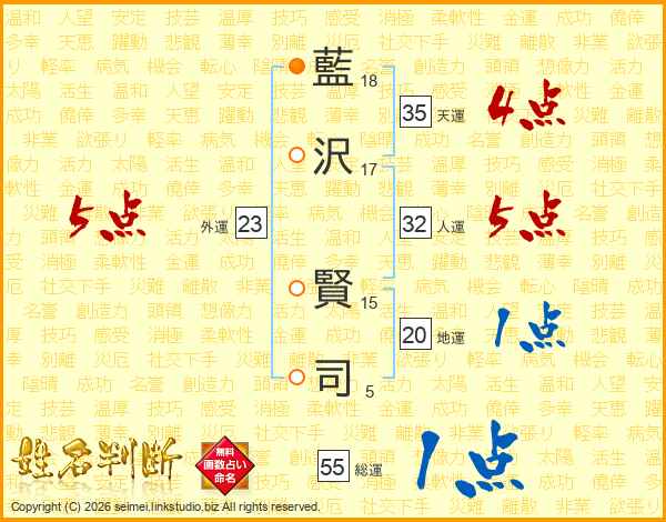 藍(18画)沢(17画) 賢(15画)司(5画)