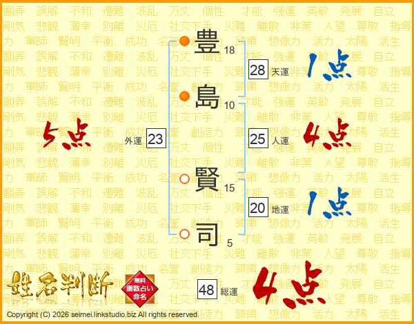 豊(18画)島(10画) 賢(15画)司(5画)