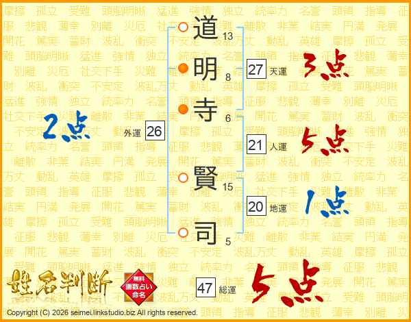 道(13画)明(8画)寺(6画) 賢(15画)司(5画)