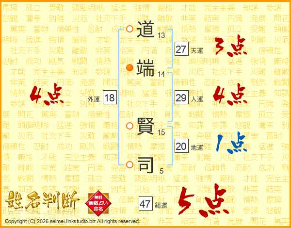 生活面を象徴する運勢です。外部から受ける影響力を表し、結婚運、家庭運や職場、環境への順応性を表します。総運から人運を引いた画数。姓や名が1文字の場合を除く。