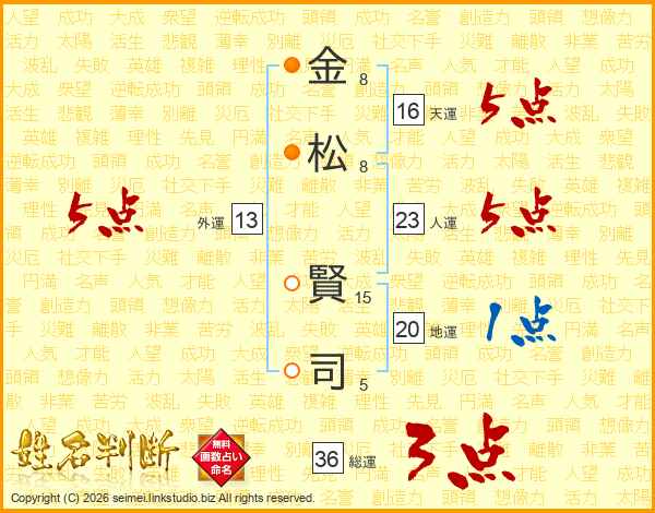 あなたの人生を表す1番重要な運勢です。生涯を通じて影響する総合運となり、主に50歳以降の晩年期に影響を及ぼします。苗字と名前の合計画数。