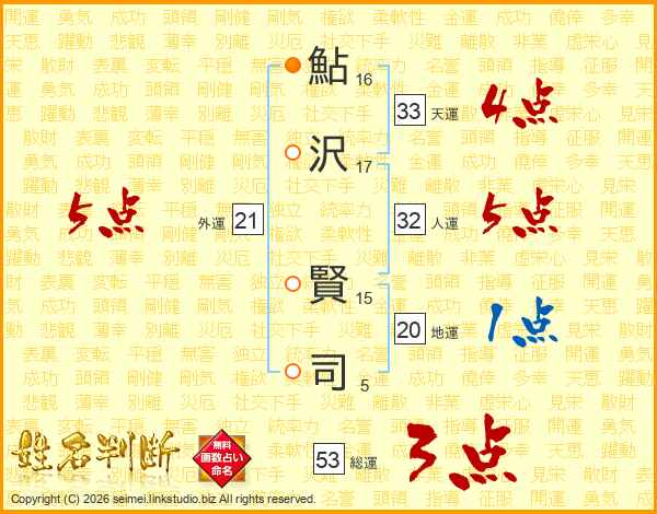 鮎(16画)沢(17画) 賢(15画)司(5画)