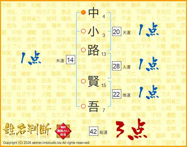 中(4画)小(3画)路(13画) 賢(15画)吾(7画)